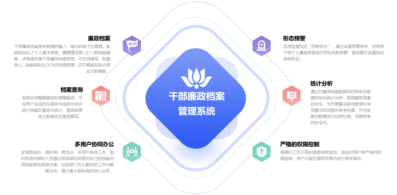 干部廉政檔案管理系統(tǒng)通過(guò)建立各級(jí)干部廉政檔案信息庫(kù),可以方便地查閱、統(tǒng)計(jì)和歸檔,實(shí)現(xiàn)了廉政檔案管理的規(guī)范化、電子化、網(wǎng)絡(luò)化,可以準(zhǔn)確、及時(shí)、客觀地反映各級(jí)黨員干部的廉政情況,有效提高各級(jí)紀(jì)檢監(jiān)察機(jī)關(guān)的工作效率。